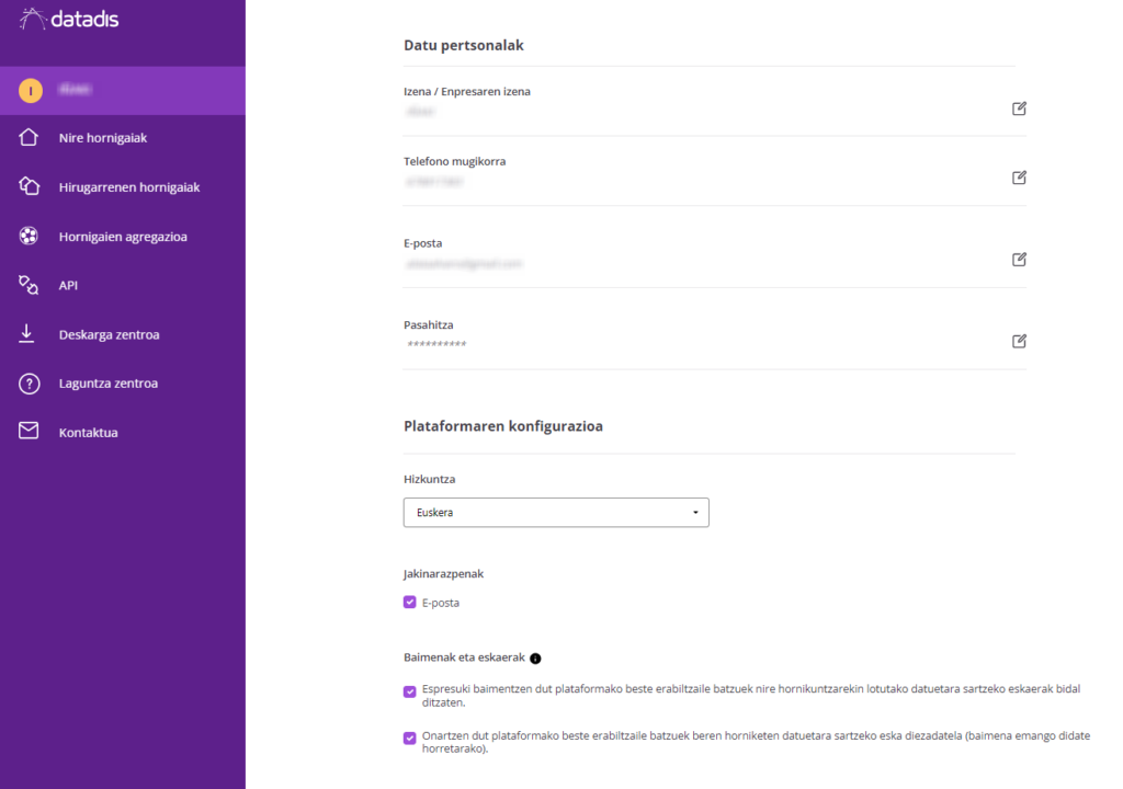 Bertan, erabiltzaile bakoitzaren datu pertsonalak eta baimenak adierazten dira. Datu pertsonalak aldatzeko aukera duzu orrialdean.