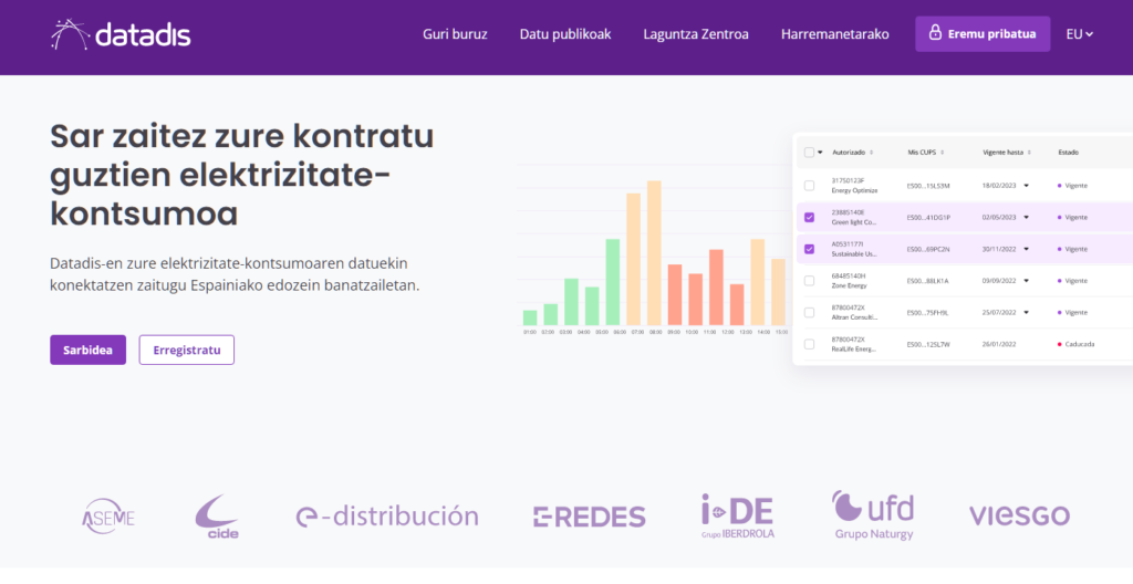 DATADIS zure argindarraren datuak eskuratzeko web-orri bat da, komerziatzailearekin loturarik ez duena. Hau da, ohiko kasua izaten da komerziatzailearen web orrian sartzea datuak eskuratzeko, alaber, DATADIS-ek aukera ezberdinak eskaintzen ditu datu horiek aztertzeko. Horrela, kontsumo, potentzi… informazioa hobeto ulertzeko aukera ematen duelarik.