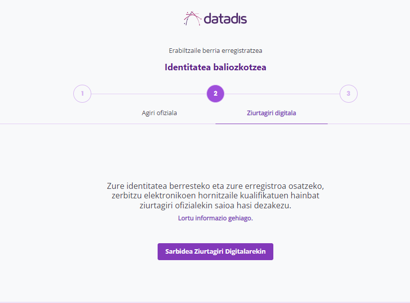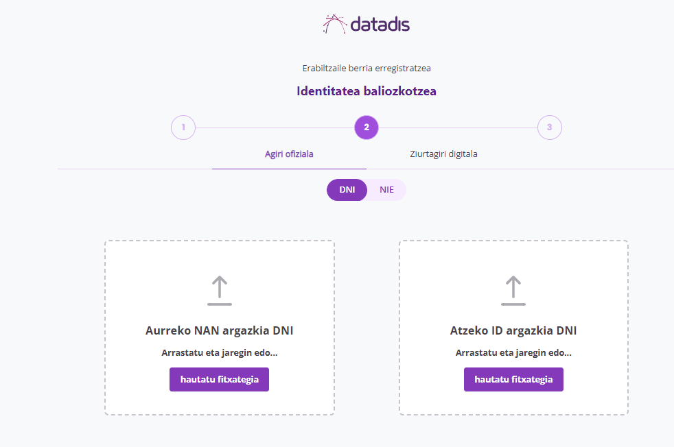 Identitatea balioztatzeko bi aukera ezberdin daude. Batetik, nortasun agiria (NAN) erabiliz egitea eta, bestetik, ziurtagiri digital bidez.